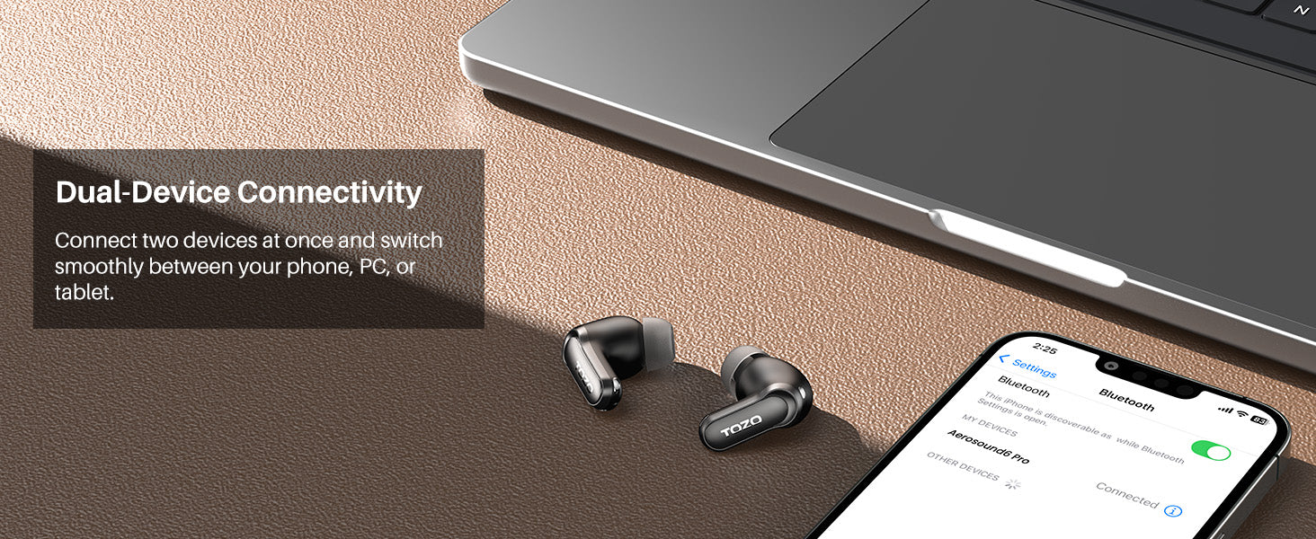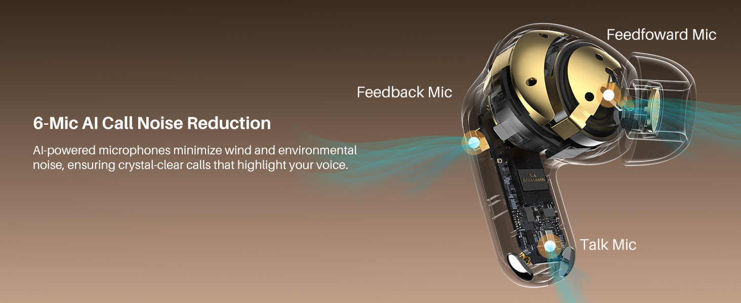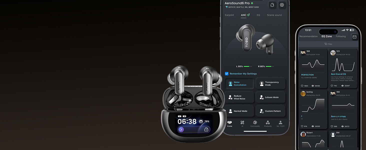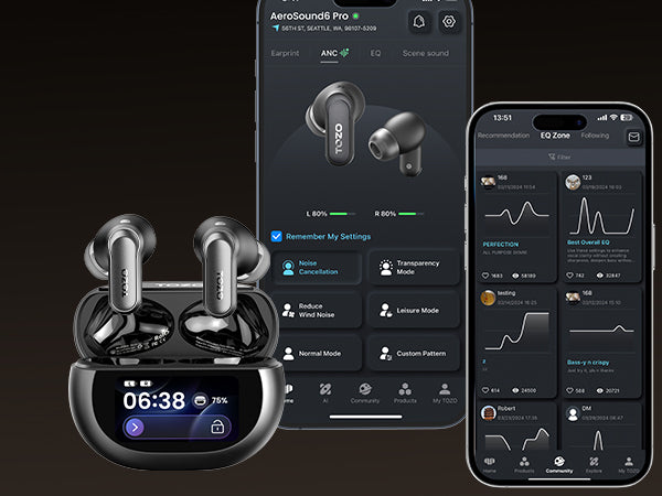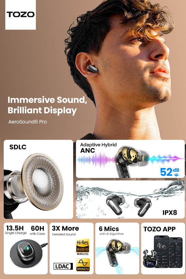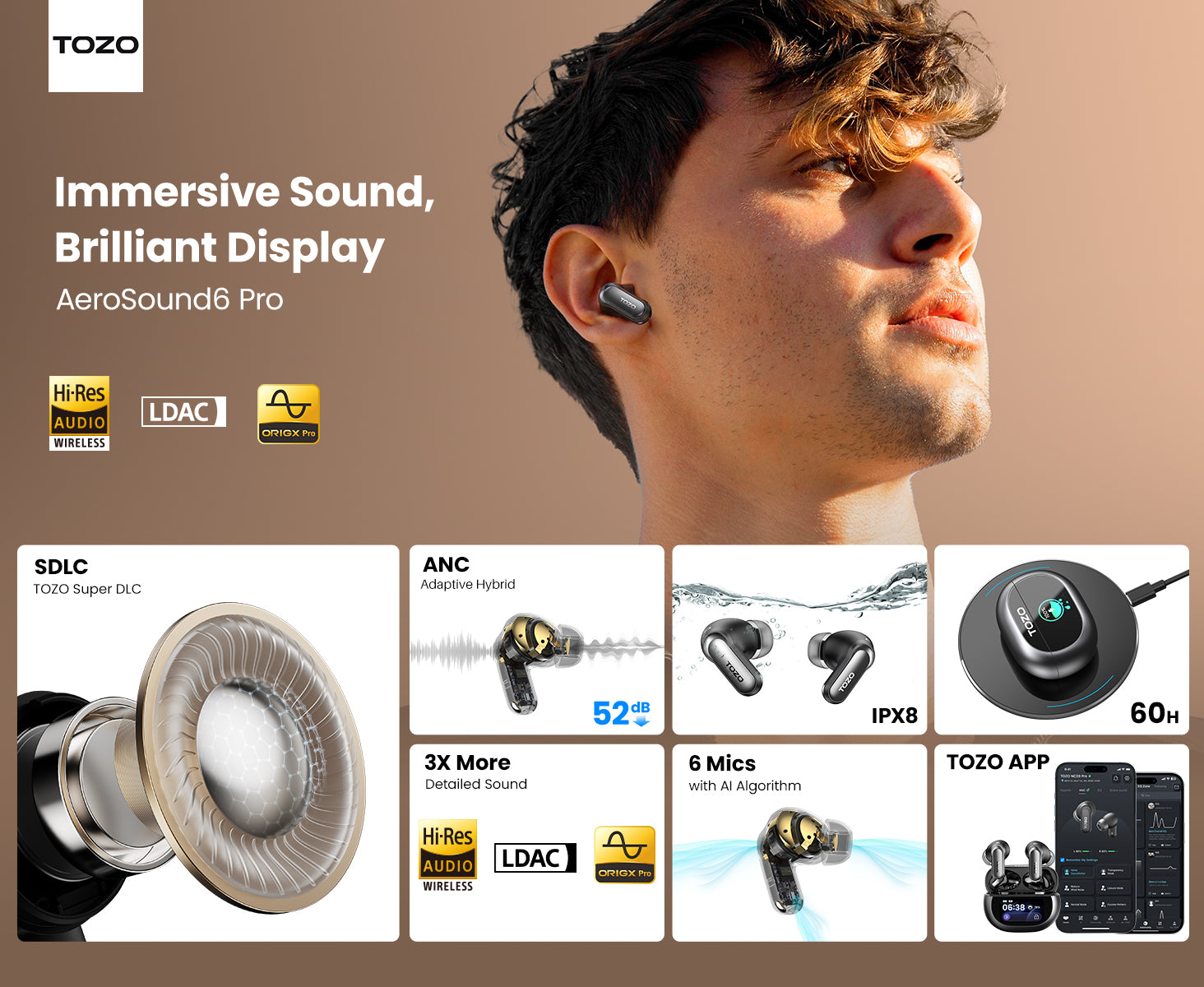 Experience the perfect blend of studio-quality sound and smart innovation. With the AeroSound6 Pro's touchscreen charging case, you get effortless control over powerful noise cancellation, Hi-Res Audio, and immersive Spatial Audio. Enjoy your music your way, with convenience and clarity.