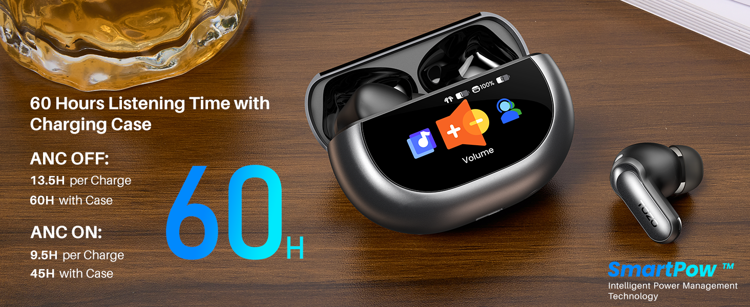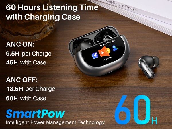 Total playtime with charging case: ANC OFF 60hrs, ANC ON 45hrs